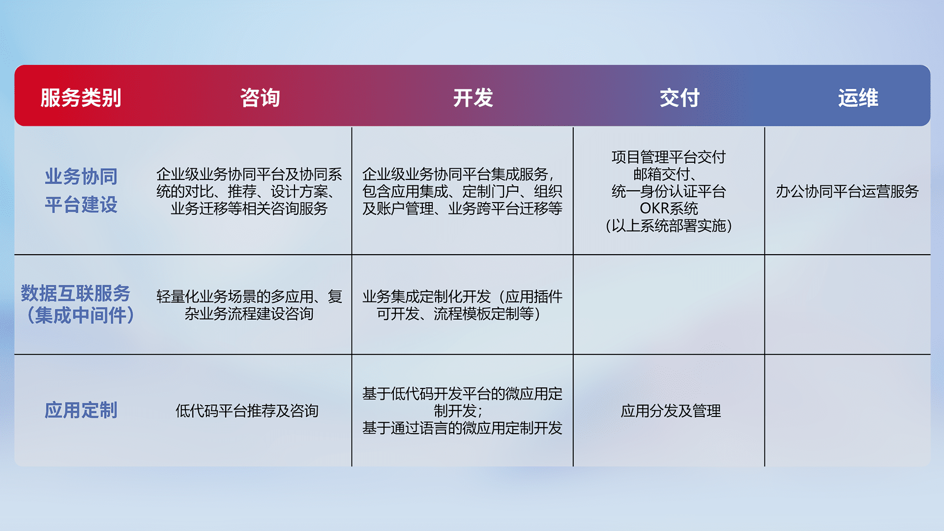 针对钉钉、、、企微、、IDaas等平台级产品提供产品的规划、、、方案、、交付、、、定制化开发等服务,,,,实现如统一协同办公、、、智能客户服务、、、、混合会议管理、、智能数据查询、、、等业务场景,,,实现数字化转型。。。